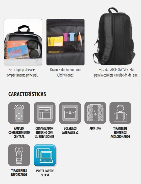• Mochila con amplio compartimento con Porta Laptop Sleeve y compartimento secundario.