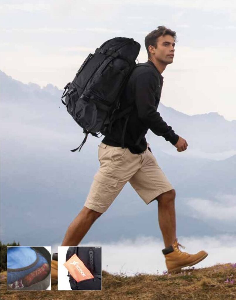 • Incluye cobertor de lluvia ubicado en un bolsillo con cierre en la base de la mochila.